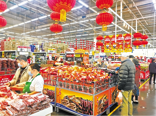 记者在沃尔玛(国贸店)看到,超市备货充足,前来选购年货的市民络绎不绝,粮油、零食、坚果、腊肉等产品较受欢迎。