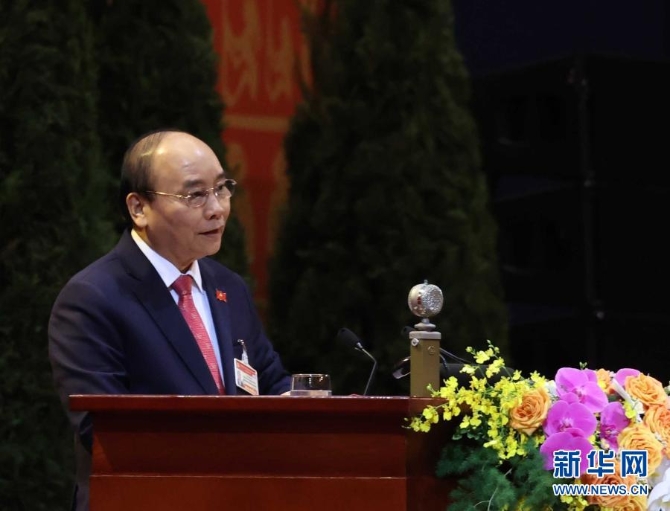 1月26日,在越南首都河内,越共中央政治局委员、政府总理阮春福在越南共产党第十三次全国代表大会开幕式上致辞。新华社/越通社
