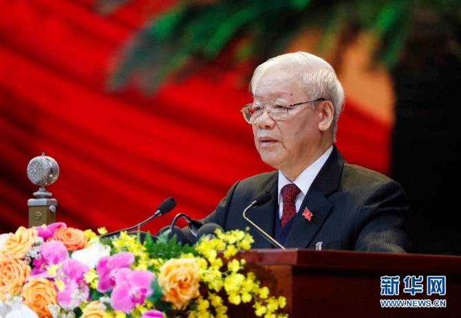 1月26日,在越南首都河内,越共中央总书记、国家主席阮富仲作第十二届中央委员会提交的报告。新华社/越通社