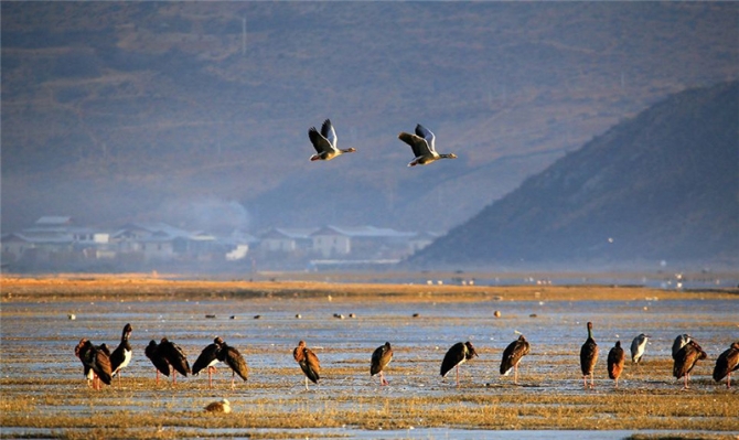 冬季的纳帕海是“鸟的天堂”,留下了万鸟栖息香格里拉的独特风景。