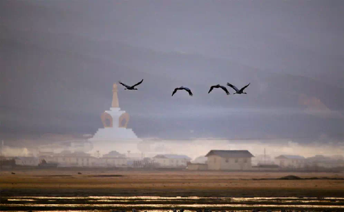 每年,迪庆州都会在冬季推出以“生态迪庆·飞羽天堂”为主题的国际观鸟节,黑颈鹤、金雕、斑头雁等珍稀鸟类在雪花覆盖的草丛中、水面上嬉戏漫游,为高原草甸带来勃勃生机。在纳帕海湿地,每年约有300只头顶皮肤血红色、并布有稀疏发状羽的黑颈鹤在此越冬,翱翔在这片广袤的天空,场景蔚为壮观。