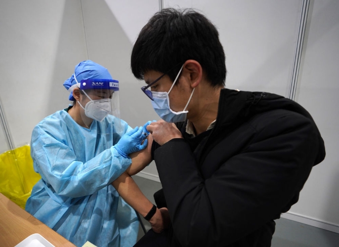 1月26日,在设立于北京市朝阳规划艺术馆的接种点,市民接种疫苗。新华社记者 贾浩成 摄