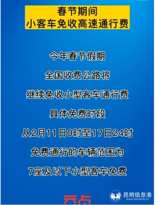 昆明信息港讯 实习记者邓国梅 1月28日,记者从交通运输部获悉,根据国务院有关通知,今年春节假期,全国收费公路将继续免收小型客车通行费,具体免费时段为2月11日0时至17日24时。