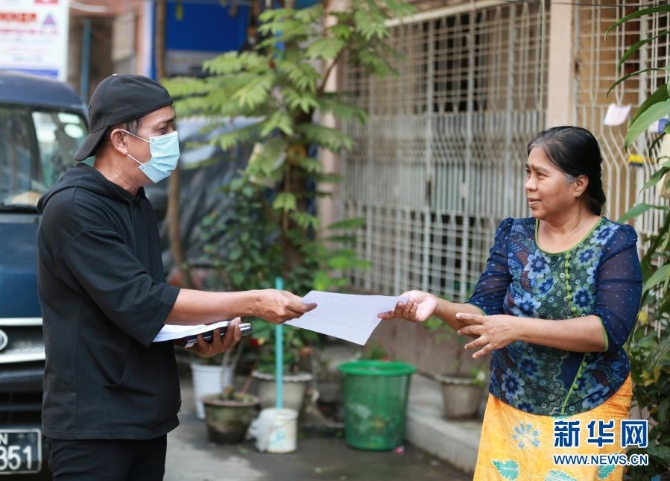 1月24日,缅甸仰光的一名社区管理办公室工作人员向居民发放新冠疫苗接种登记表。新华社记者 张东强/摄