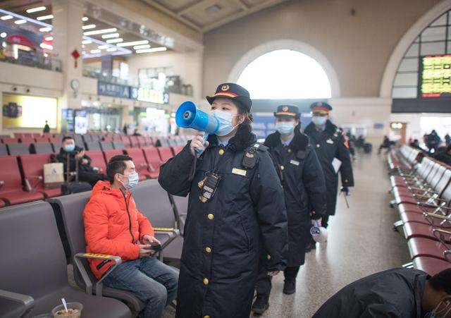汉口火车站的工作人员在候车厅宣讲乘车防疫事项。(图源:新华网)