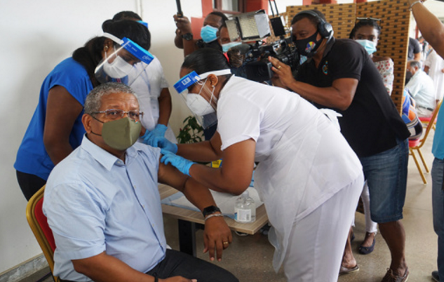 △塞舌尔总统拉姆卡拉旺接种中国生产的新冠肺炎疫苗
