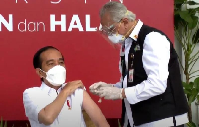 当地时间1月13日,印度尼西亚总统佐科在总统府接种了中国科兴生物制药公司的新冠疫苗,并在网络直播中展示了自己接种疫苗的过程。