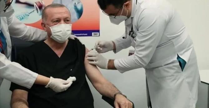 当地时间1月14日,土耳其总统埃尔多安在安卡拉城市医院接种中国北京科兴中维生物技术有限公司的克尔来福新冠疫苗。