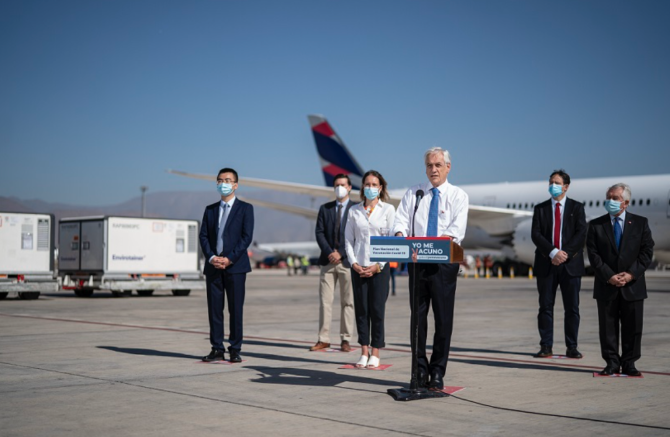 当地时间1月28日,由中国科兴公司研发的新冠疫苗运抵智利。智利总统皮涅拉亲自前往机场迎接。皮涅拉宣布,智利将会从2月3日开始进行大规模疫苗接种工作。