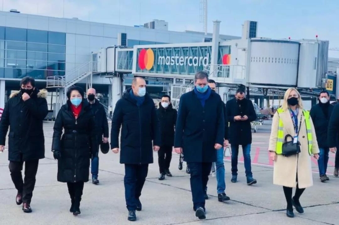 当地时间1月16日,塞尔维亚总统武契奇亲赴机场迎接首批中国产新冠疫苗的抵达。