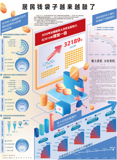 更难能可贵的是,2020年全国居民人均可支配收入比2010年增加一倍的目标如期实现,这充分说明民生保障“有力有效”。
