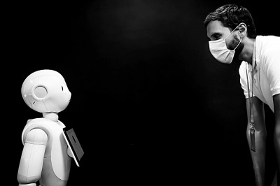 在法国巴黎的软银机器人公司,机器人Pepper展示检测人们是否正确佩戴口罩的功能。新华社发