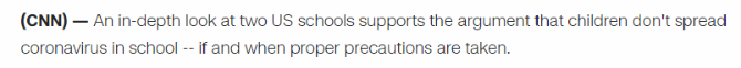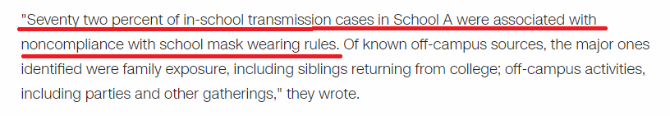美国有线电视新闻网(CNN)援引一项针对美国两所独立学校的最新研究指出,如果采取适当的预防措施,孩子们就不会在学校里传播病毒。研究人员发现,在其中一所学校中,72%的在校传播病例都与不遵守学校的口罩政策有关。