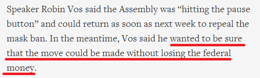 去年8月,威斯康星州州长、民主党人埃弗斯开始强制在全州范围内佩戴口罩,但共和党州议员认为这是“越权”行为。本月26日,该州参议院表决推翻了州长的口罩令。但在28日正式表决时,共和党议员们却因“突然得到的消息”暂时放弃了这个想法。原来,美国国会去年通过的疫情救助法案规定,各州只有实施紧急卫生令,才能获得联邦额外资金用于发放食品券。这就是说,如果威斯康星州议会终止口罩令,该州近24.3万户家庭将无法获得每月4930万美元的联邦食品援助。