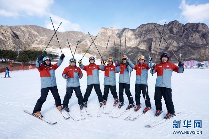 这是2017年12月7日,北京延庆区张山营镇海坨滑雪队成员在训练结束后合影。新华社记者鞠焕宗摄