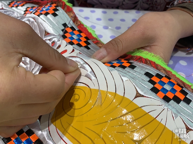 25岁的杨文丽是这家扶贫车间的负责人,她的刺绣手艺是从小跟母亲学的。杨文丽告诉《时政新闻眼》,苗绣分手工绣和机绣。一件手工绣的“歪梳苗服饰”要卖到上万元。如今,车间的苗绣成品有近70%是通过直播带货销售出去的。