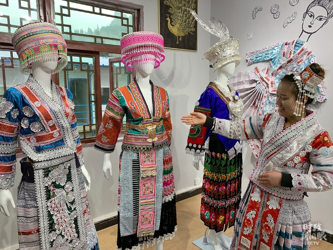 △杨文丽正在介绍“歪梳苗服饰”。(总台央视记者段德文拍摄)