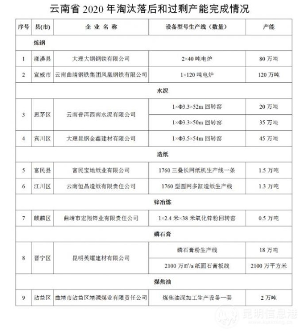昆明信息港讯 实习记者朱俊杰 记者从云南省工业和信息化厅官网了解到,2020年云南省完成炼钢、水泥、造纸、锌冶炼、磷石膏和煤焦油6个行业落后和过剩产能淘汰工作,涉及9家公司,其中炼钢淘汰产能最多达200万吨。