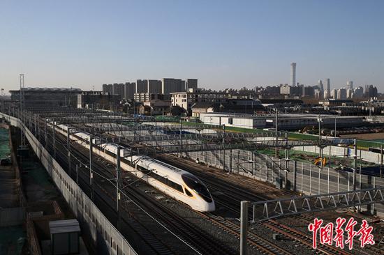2021年1月28日,全国春运第一天,G931次高铁列车从新落成的北京朝阳站驶出,开往长春方向。远处位于北京CBD附近的中国尊大厦清晰可见。中青报·中青网记者 陈剑/摄