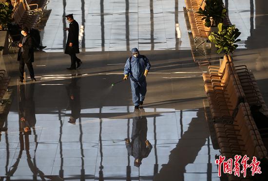 2021年1月29日,北京朝阳站,当天是全国春运第二天,专职消杀员徐桂金在车站二层候车大厅进行例行防疫消杀。中青报·中青网记者 陈剑/摄