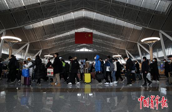 2021年1月22日,北京朝阳站,乘客排队保持社交距离有序候车。当日,京哈高铁北京至承德段正式开通运营,京哈高铁实现全线贯通。中青报·中青网记者 陈剑/摄