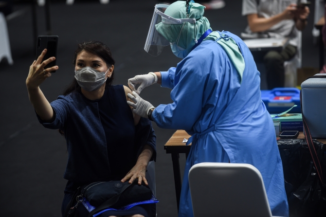 ↑ 2月4日,一名医务工作者在印度尼西亚雅加达接种中国科兴公司的新冠疫苗后自拍。