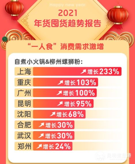 根据趋势报告,就地过年在很多城市都催生了“一人食”消费需求,自煮小火锅在昆明猛增95%。