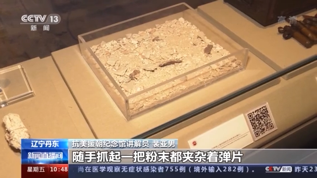 抗美援朝纪念馆讲解员 裴亚男:在这里我们也可以看到随手抓起一把粉末都夹杂着弹片,也是从上甘岭阵地中取回来的,是国家的一级文物。