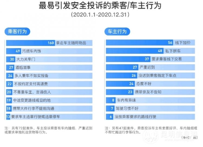 经查实有效的816起安全投诉中,包括非骚扰类763起和骚扰类53起。在763起非骚扰类安全投诉中,拿走车主随用物品、污损车内饰、大力关车门位列易引发安全投诉的乘客行为前三,分别引起安全投诉160起、49起、30起;而车主行为中,线下加价、私下拼车、要求乘客线下交易引发的投诉最多,分别为56起、48起、37起,占对车主安全投诉总数的46%。