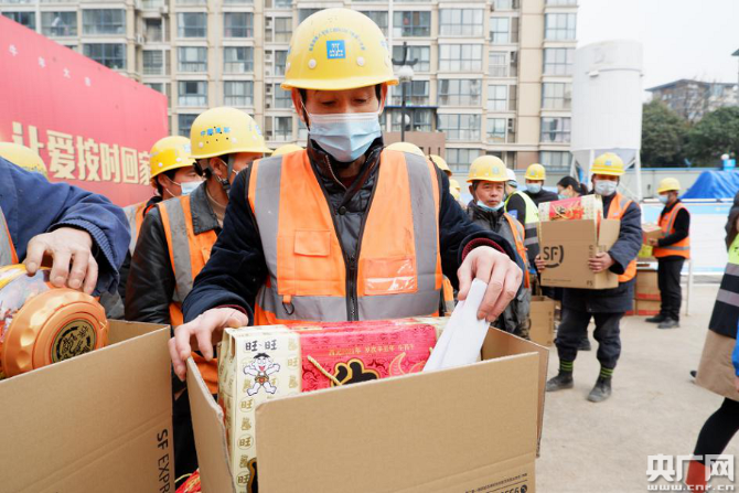 2月4日,陕西省建设工会联合中建五局西北公司为80余名“留陕过年”的工人发放年货,并为有需要的工人免费邮寄回家,年货刚拿到手,廖景文就将东西和信都装进了快递箱,一起寄回了四川南充老家。