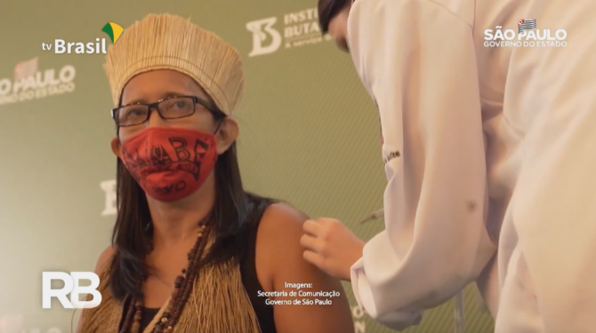 1月17日,巴西原住民中首位新冠疫苗接种者瓦努莎·凯姆贝在圣保罗大学临床医院接种中国新冠疫苗克尔来福。(视频截图)