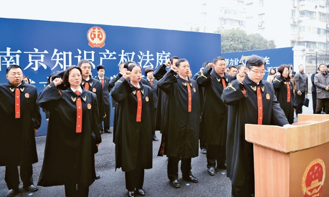 2017年至今,南京、武汉、深圳等22个地方法院知识产权法庭陆续设立,知识产权案件管辖布局不断优化,知识产权专门化审判体系建设不断深入。图为2017年1月19日南京知识产权法庭揭牌当日,全体法官进行宪法宣誓。南京市中级人民法院供图