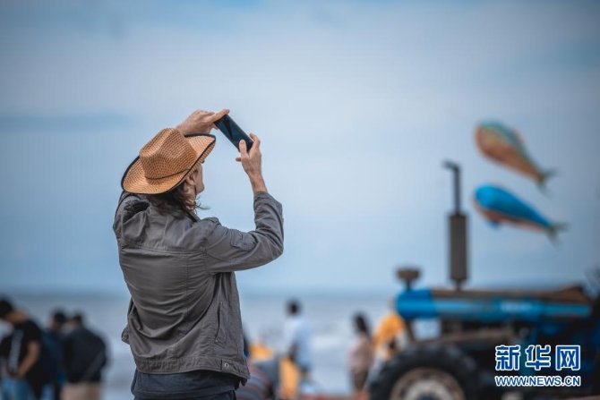 2月6日,在新西兰惠灵顿北部小镇奥塔基的海滩上,一名观众在拍摄风筝。新华社发(张健勇摄)