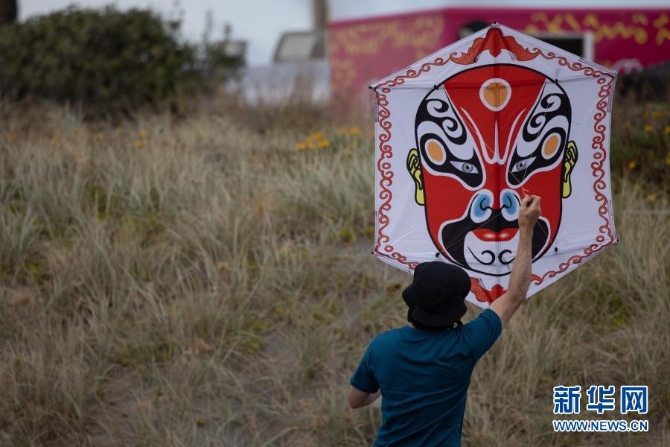2月6日,在新西兰惠灵顿北部小镇奥塔基的海滩上,一名男子准备放飞京剧脸谱元素风筝。新华社发(张健勇摄)