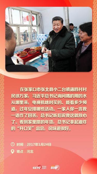 党的十八大以来,每到春节前夕,习近平总书记总是带着心中牵挂,深入到群众当中拉家常、问冷暖、听民声、送祝福。用老百姓的话说,“总书记没有一点架子,到家里就跟走亲戚一样”。
