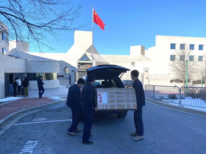 根据中国驻美使馆官方发布,2021年新春佳节将至,面对美国国内严峻疫情形势,为传递祖国的关爱与节日祝福,帮助确有困难的中国留学生、侨胞度过一个平安、健康的春节,根据国内统一部署,中国驻美国使馆迅速行动,准备了一批防疫物资“春节包”,通过领区20多个学联会和8个侨团、老人中心向当地留学生和侨胞分发。