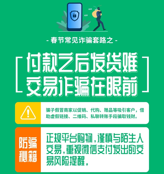 防骗秘籍:与陌生人进行网络交易必须小心再小心,请大家尽量在正规平台购物,遇到贵重商品售价奇低更需谨慎,如在交易过程中看到微信支付发出的拦截或提醒,说明本次交易存在一定风险,请勿轻易向陌生人打款,以防上当。