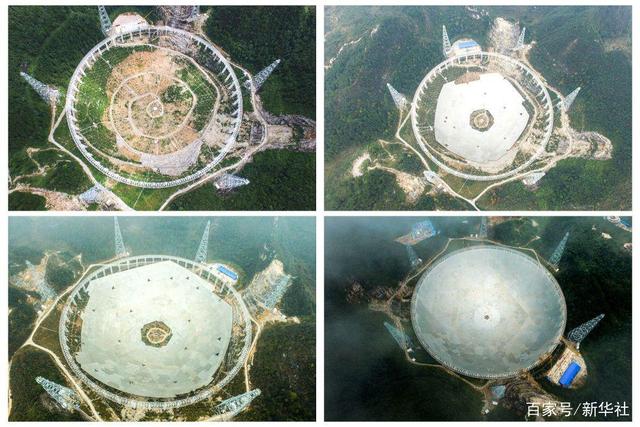 这是一张拼版照片,左上为FAST项目拼装第一块反射面板(2015年8月2日摄)、右上为FAST反射面板安装近半(2015年12月16日摄)、左下为FAST项目反射面板安装近八成(2016年3月9日摄)、右下为FAST项目反射面板安装完成(2016年7月3日摄)。新华社记者 欧东衢 摄
