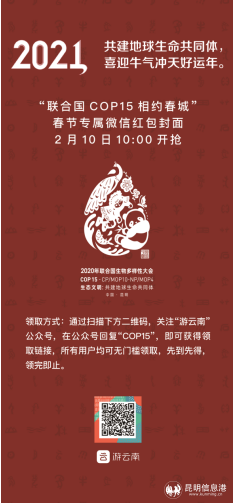 2月10日,“游云南”与联合国《生物多样性公约》第十五次缔约方大会(COP15)云南省筹备办新闻宣传部推出COP15春节微信红包封面,面向所有微信用户发放。