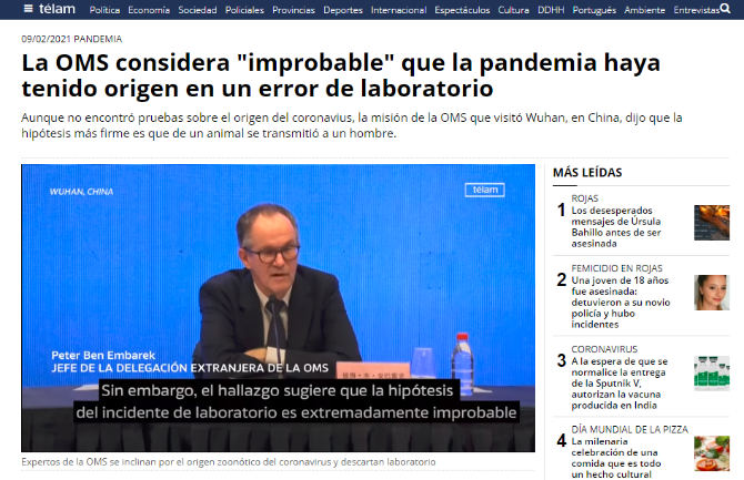 阿根廷国家通讯社美洲通讯社9日刊文称,通过在中国武汉广泛的走访与深入考察,中国与世卫联合专家组对在华新冠病毒溯源调查做出初步认定,认为新冠病毒“比较可能”是经中间动物宿主传给人类,也“可能”是直接传播或者通过冷链食品传给人类,但“极不可能”是通过实验室传给人类。文章称,这一认定澄清了新冠病毒并非来自武汉病毒所的事实。
