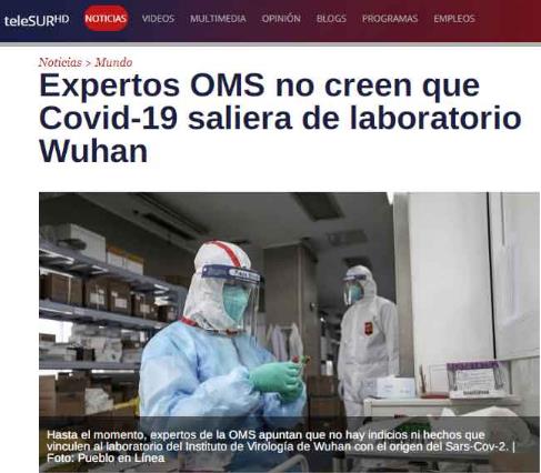 拉美地区重要的跨国媒体委内瑞拉南方电视台则在近期持续关注世卫国际专家在武汉的考察,并报道说,专家在走访武汉病毒研究所后,对该所的安全性、设备的完备性等给出高度评价,也对中国专家团队对新冠病毒的研究表示肯定。同时,世卫组织官员也对中国在调查过程中的全力配合表达赞赏。