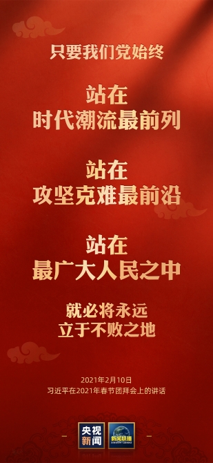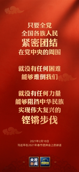 中共中央、国务院10日上午在人民大会堂举行2021年春节团拜会。中共中央总书记、国家主席、中央军委主席习近平发表讲话,代表党中央、国务院,向全国各族人民,向香港特别行政区同胞、澳门特别行政区同胞、台湾同胞和海外侨胞拜年↓