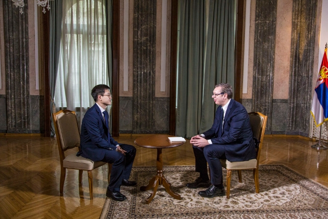 2月8日,在塞尔维亚首都贝尔格莱德,塞尔维亚总统武契奇(右)接受新华社记者专访。(新华社发,王韡摄)