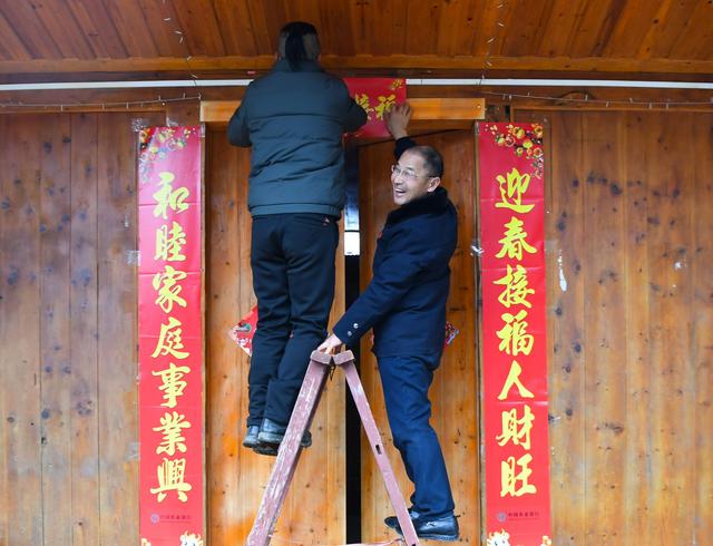 2月5日,张忠富(右)与金河村脱贫户邓先鹤一起贴春联。