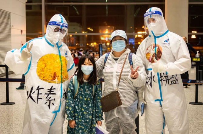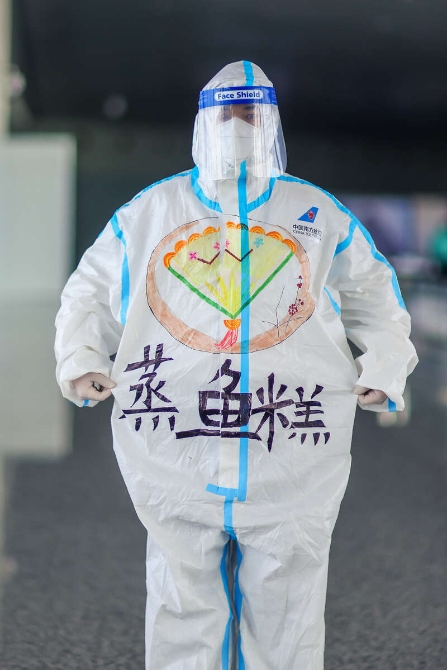 由于回国航班上大多数旅客是华人,负责保障国际进港航班的南方航空地面服务工作人员,用小小的画笔把各自老家的年夜饭画上防护服。他们希望通过这种方式,给旅客送上节日的祝福,让他们感受浓厚的“年味”。