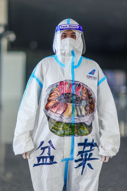 老家在广东广州的叶桂昌,防护服上绘制的是盆菜。(摄影:辛阳)