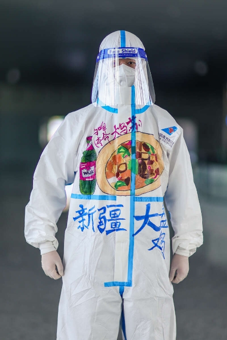 老家在新疆的陈伟,防护服上绘制的是大盘鸡。(摄影:辛阳)