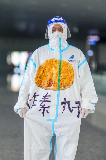 老家在黑龙江的武鹏,防护服上绘制的是酸菜饺子。(摄影:辛阳)