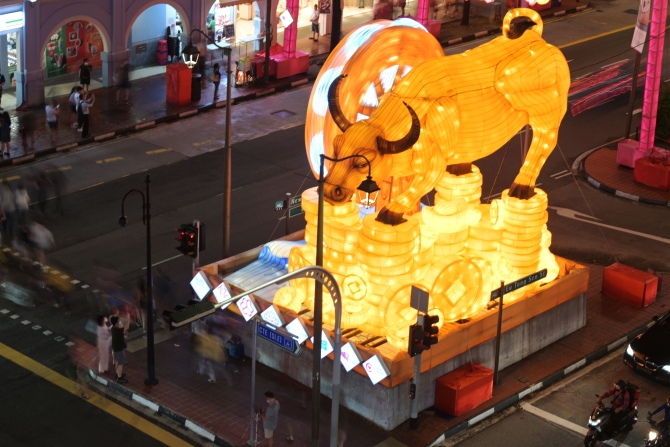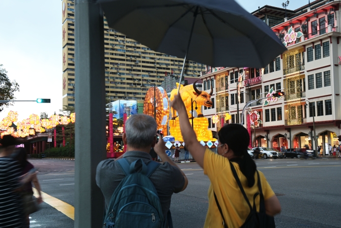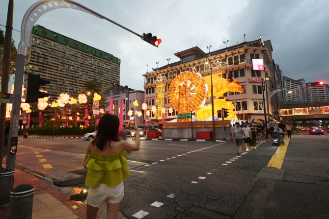 2月10日,市民在新加坡牛车水拍摄农历新年灯饰。