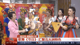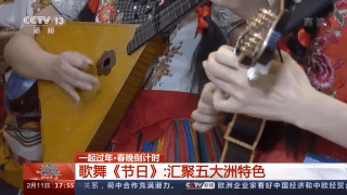 今晚,即将登上春晚舞台的东方歌舞团演员正在后台忙碌地准备着,他们衣着亮丽,五彩缤纷。他们将带来歌舞《节日》,这是一个汇聚五大洲特色的节目。其中,每个人手中民族乐器就各有特色。